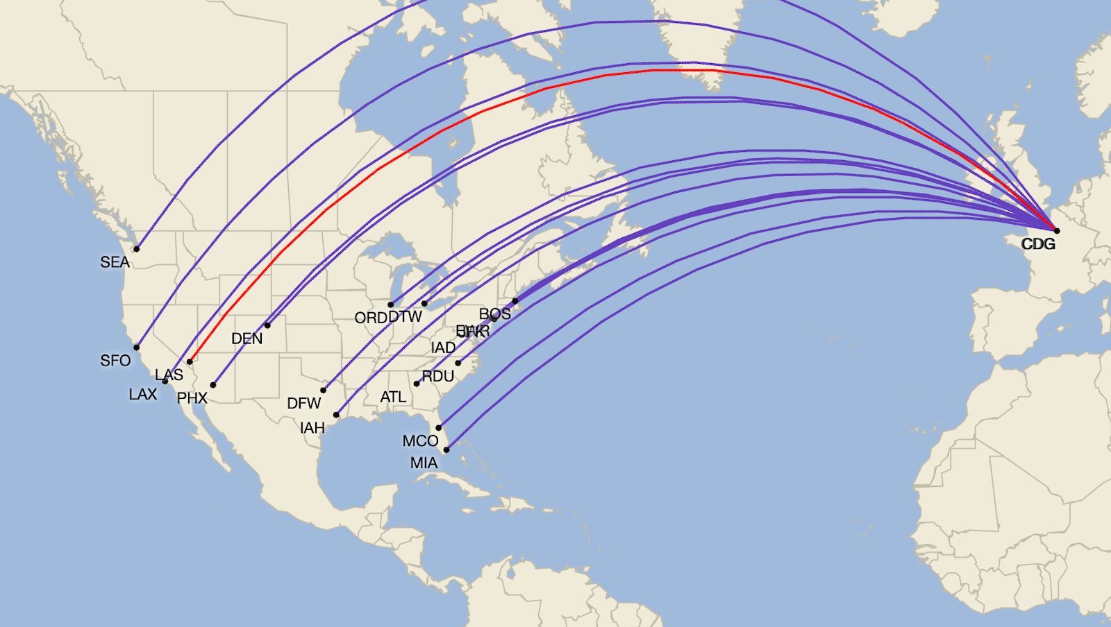 - LAS-CDG: departs at 5:50 p.m. PDT and arrives at 1:05 p.m. local time the next day