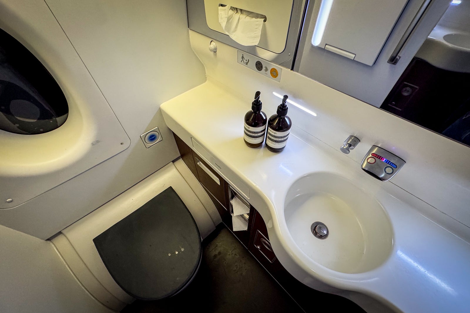 There are two dedicated first-class lavatories at the front of the cabin on either side of the plane’s staircase. The crew kept them spotless throughout the flight, and they were stocked with rosemary- and cedar-scented Aesop Resurrection Aromatique hand wash and hand balm.