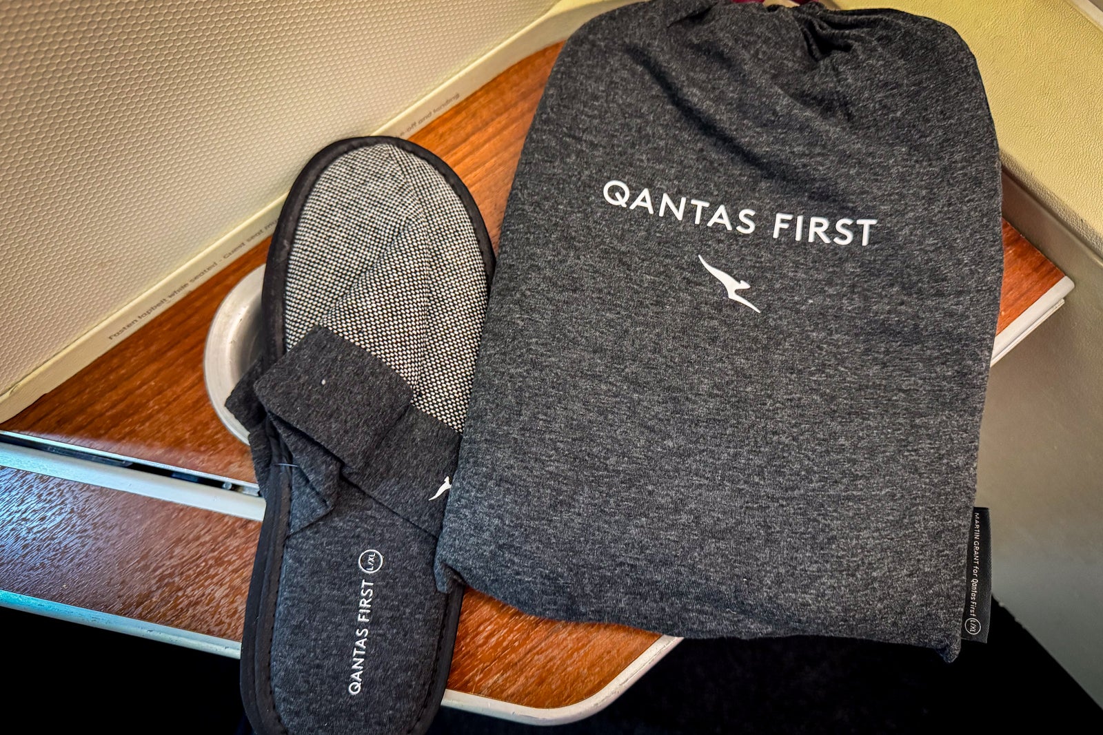 While I nibbled on those, she returned a few more times to proffer me various items, including a set of handsome gray Qantas First-branded pajamas with cute red piping along the Henley collar to go with the pair of slippers I’d found at my seat. Next, I was handed a leather folder containing the inflight dining and drinks menus.