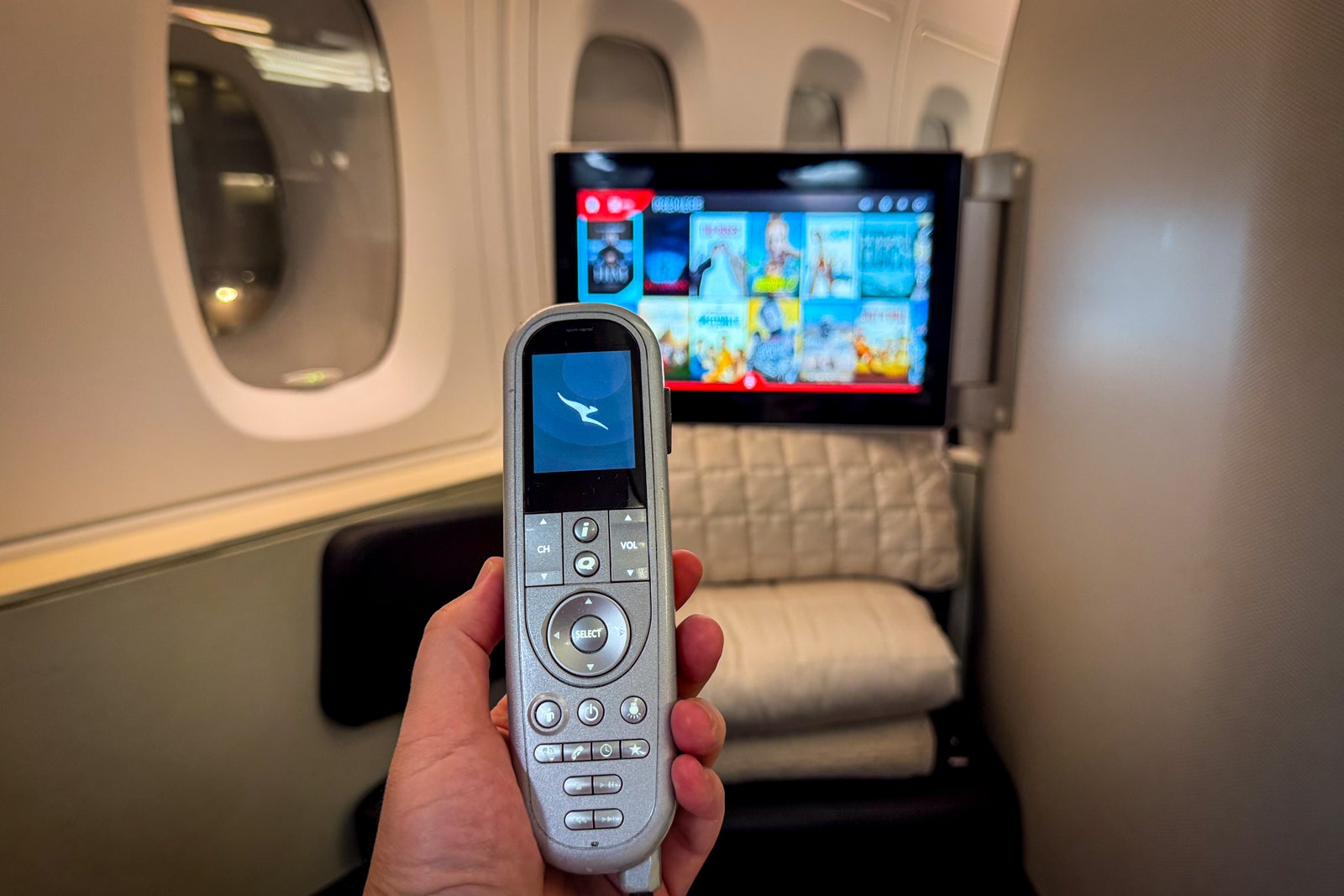 Qantas first-class seats have 18-inch entertainment monitors that swing out from the preceding seatback. They have an extensive library of content loaded into them. I found new-release movies like “One Battle After Another” and “Tron: Ares,” plus TV shows like the Australian version of “Ghosts,” “Reacher” and “All Her Fault” on hand.