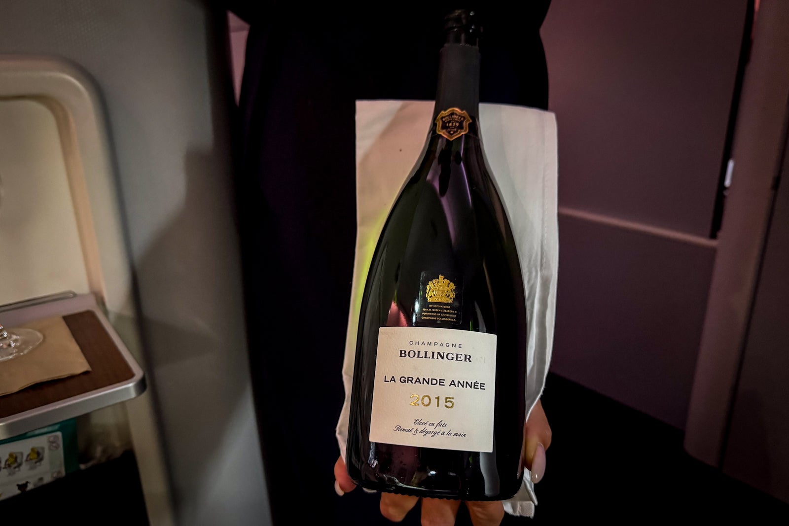 It started with another beverage served about 15 minutes after we hit cruising altitude. This time, I asked Diana for a glass of the other Champagne on board, Bollinger La Grande Annee 2015. It was a perfect inflight sip, if you ask me — crisp and elegant but with a little heft, which was nice for pairing with the two accompanying canapes, including one with caviar and Vermont creme fraiche and another with a tapioca croquette with ratatouille and pecorino cheese.