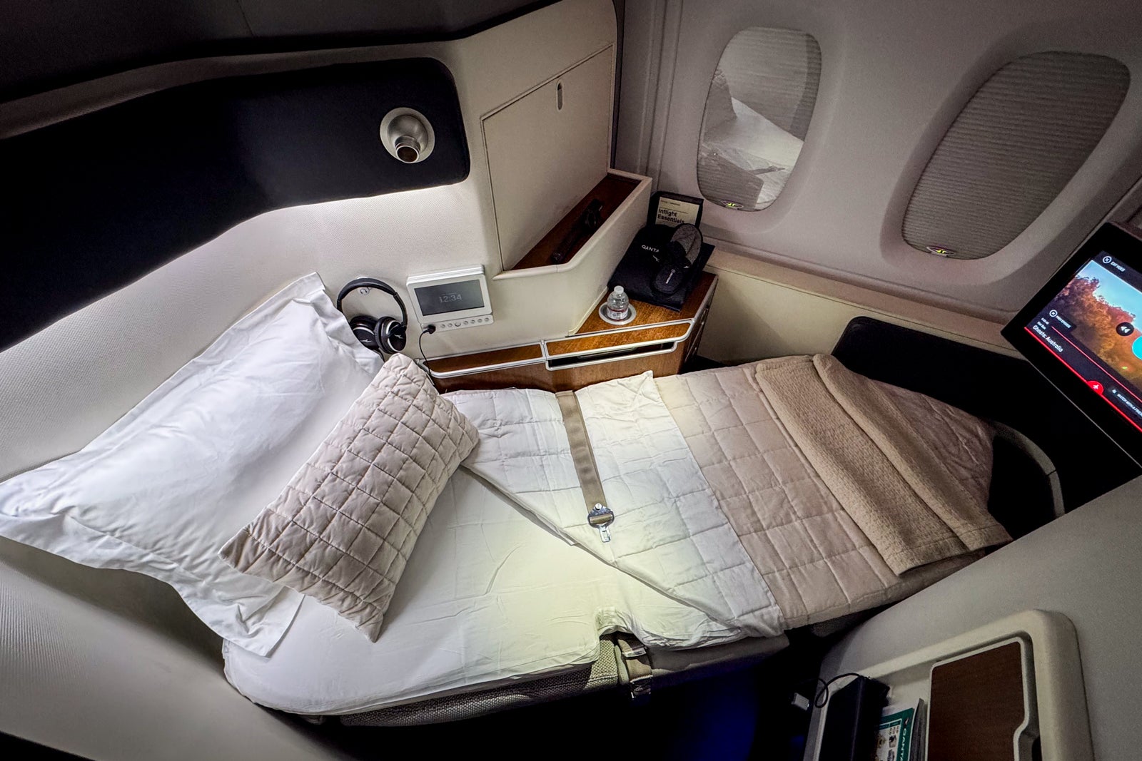I was ready for a long snooze after dinner. While I changed into pajamas, the flight attendant taking care of my aisle provided turndown service, transforming my seat into an 84-inch lie-flat bed that she made up (much better than I could have!) with a thick mattress pad, a soft duvet, a lightweight blanket and both a full-size pillow and a smaller padded lumbar one.